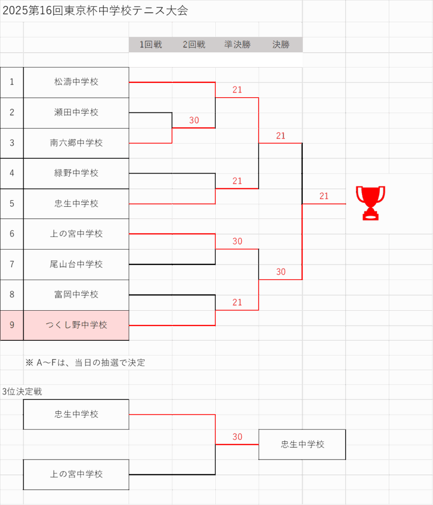 2025年第16回大会が終了しました 2025 12/27 大会 2025-12-27 大会結果 優勝 つくし野中学校(3回目、町田市立) 準優勝 松濤中学校(渋谷区立) 第3位 忠生中学校(町田市立) 第4位 上の宮中学校(横浜市立) 優勝 つくし野中学校 準優勝 松濤中学校 第3位 忠生中学校 大会 よかったらシェアしてね! URLをコピーしました! URLをコピーしました! 2025第16回大会参加中学校決まる この記事を書いた人 テニス部監督 この大会は、中学校の女子硬式テニス部の発展をお手伝いするために、2010年立ち上げた大会です。たくさんの中学生がこの大会に参加され、部員相互の団結力を高めて下さい。 本校部員が運営のお手伝いをさせていただきます。 心より、参加をお待ちしております。 関連記事 2024年第15回大会が終了しました 2024-12-28 2023年第14回大会が終了しました 2023-12-28 2022年第13回大会が終了しました 2022-12-27 2021年第12回大会が終了しました 2021-12-25